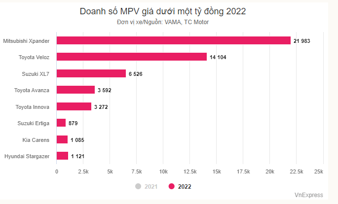 Mitsubishi Xpander đang là mẫu xe được ưa chuộng nhất ở phân khúc MPV. Năm 2022, Xpander bán 21.983 xe, vượt trội so với phần còn lại. Đây cũng là mẫu xe giành giải MPV của năm 2022 tại Car Awards 2022 do báo VnExpress tổ chức.